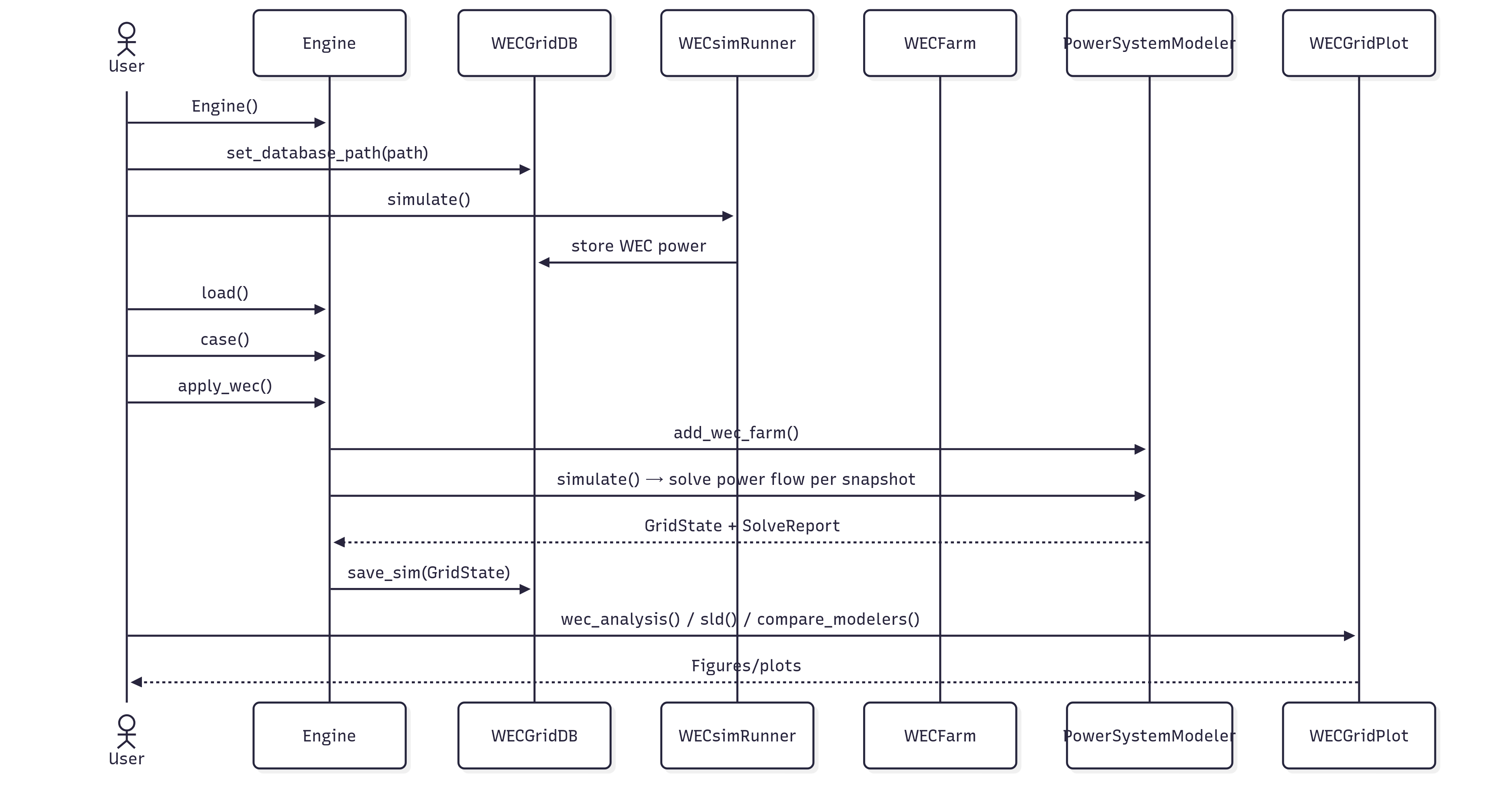 - Engine: central orchestrator that synchronizes simulation timeline, solver calls, WEC injections, and result management.