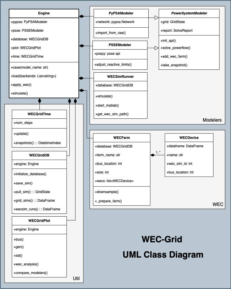 - WEC Farm and Devices: abstractions for configuring farms of WEC units, mapping them into the grid.
