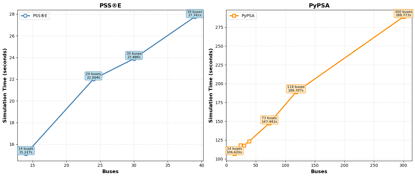 What this means: For example, with PSS®E, adding 10 more buses adds about 5 seconds to the runtime, while PyPSA adds about 6 seconds plus a higher startup cost. The very high R² confirms that scaling is highly predictable.