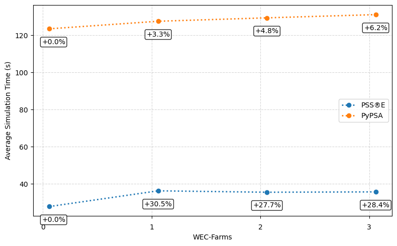 - PSS®E: ~30% fixed runtime overhead when enabling WECs, with little change beyond the first farm.